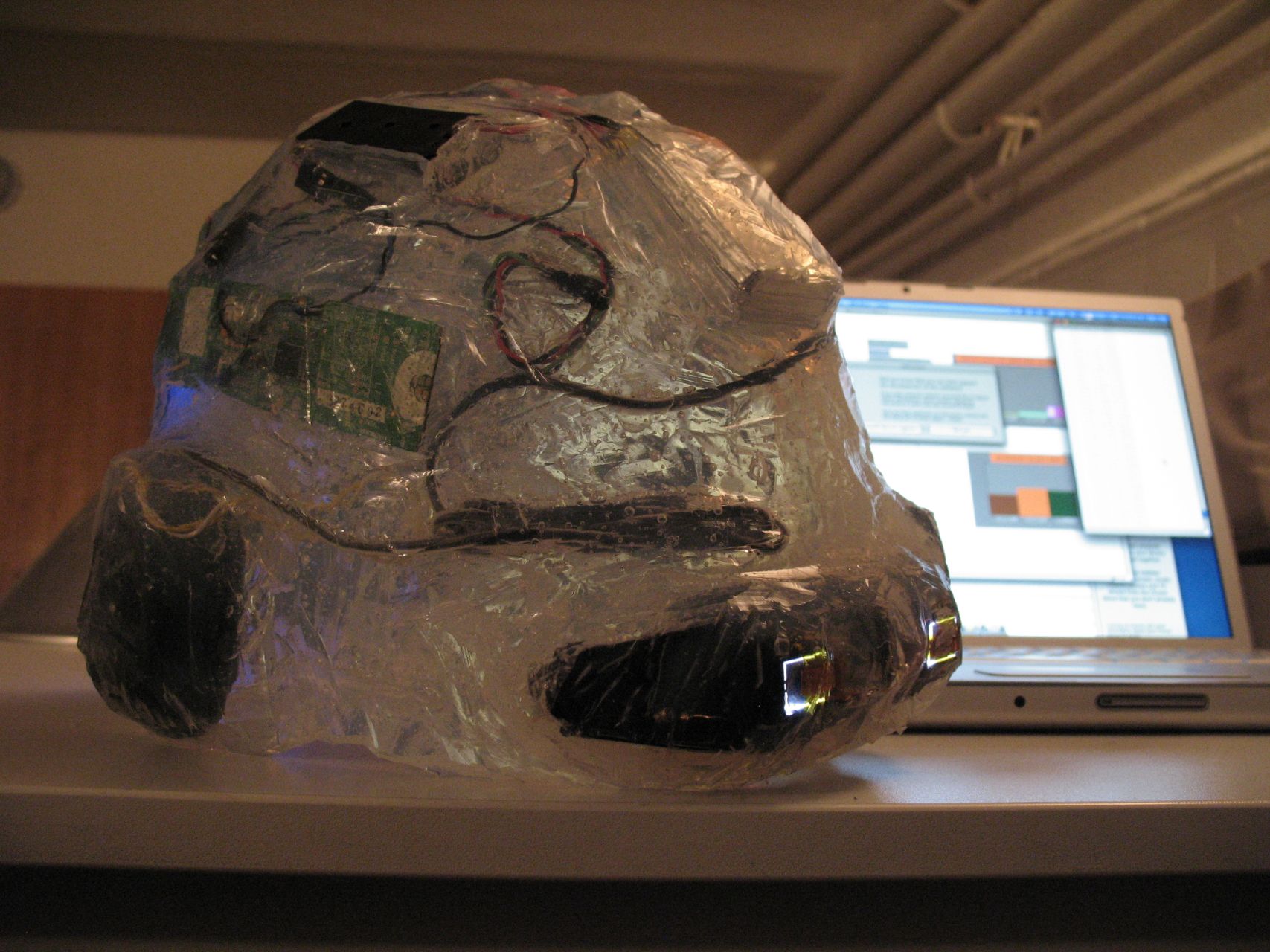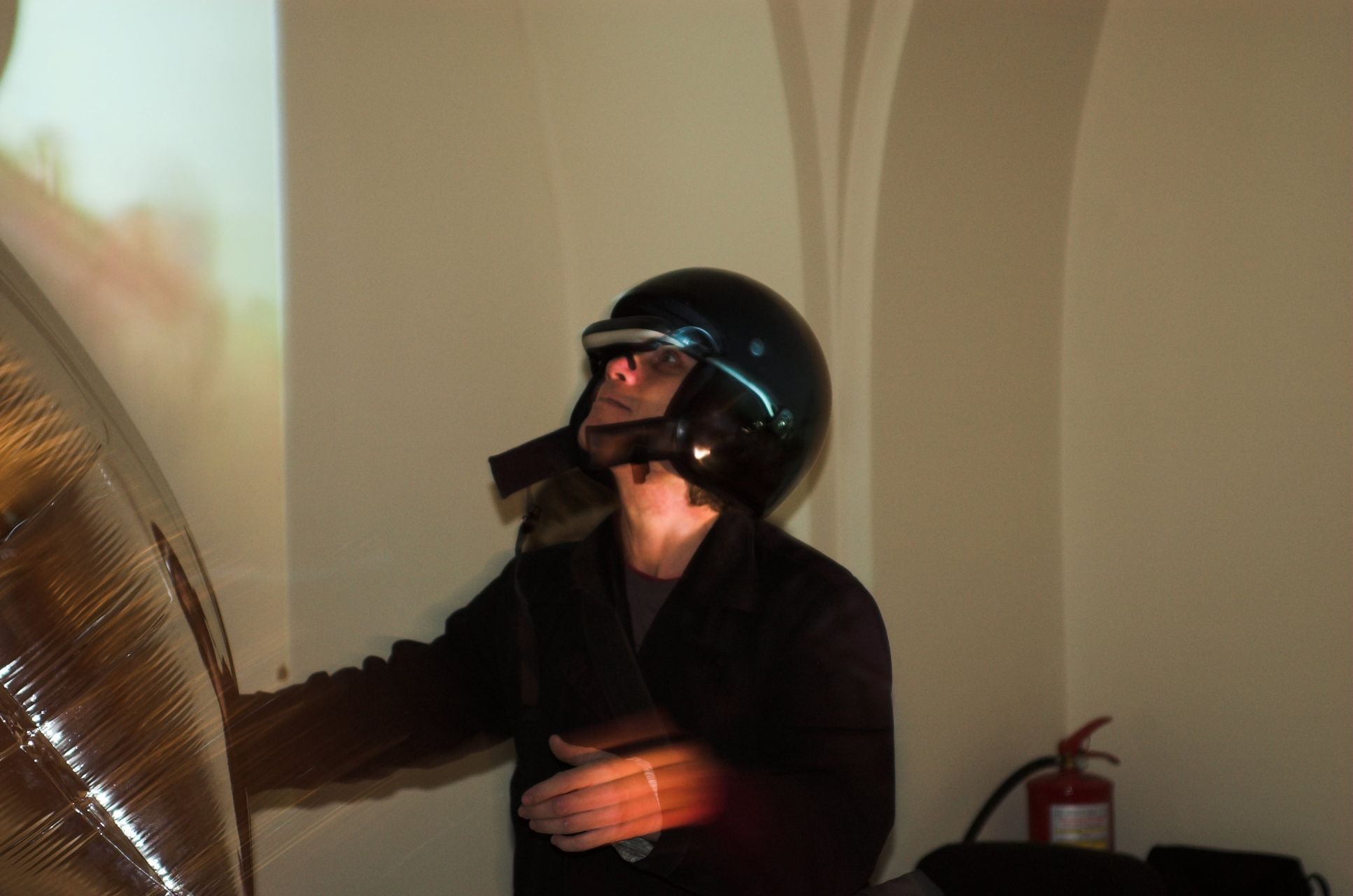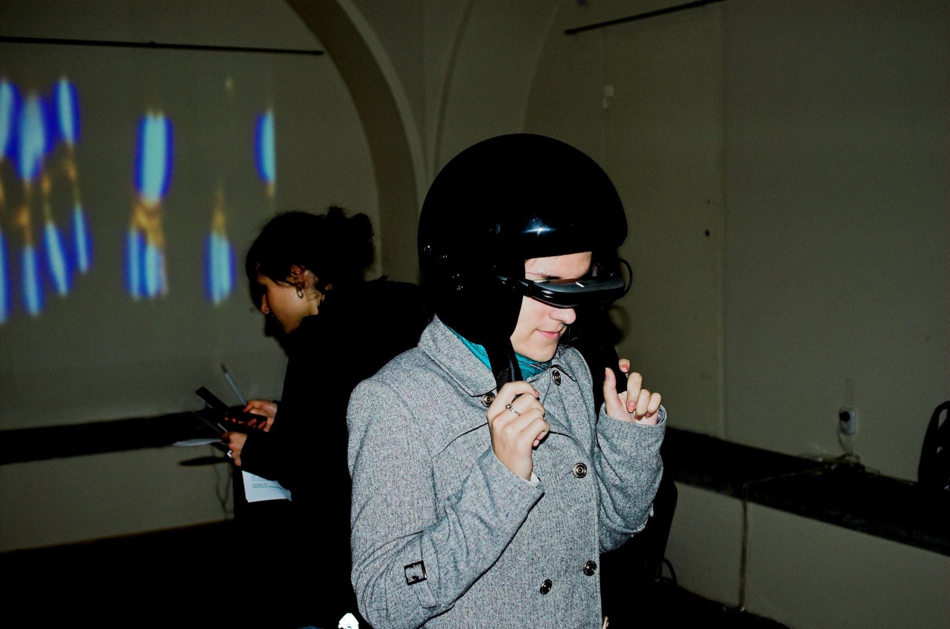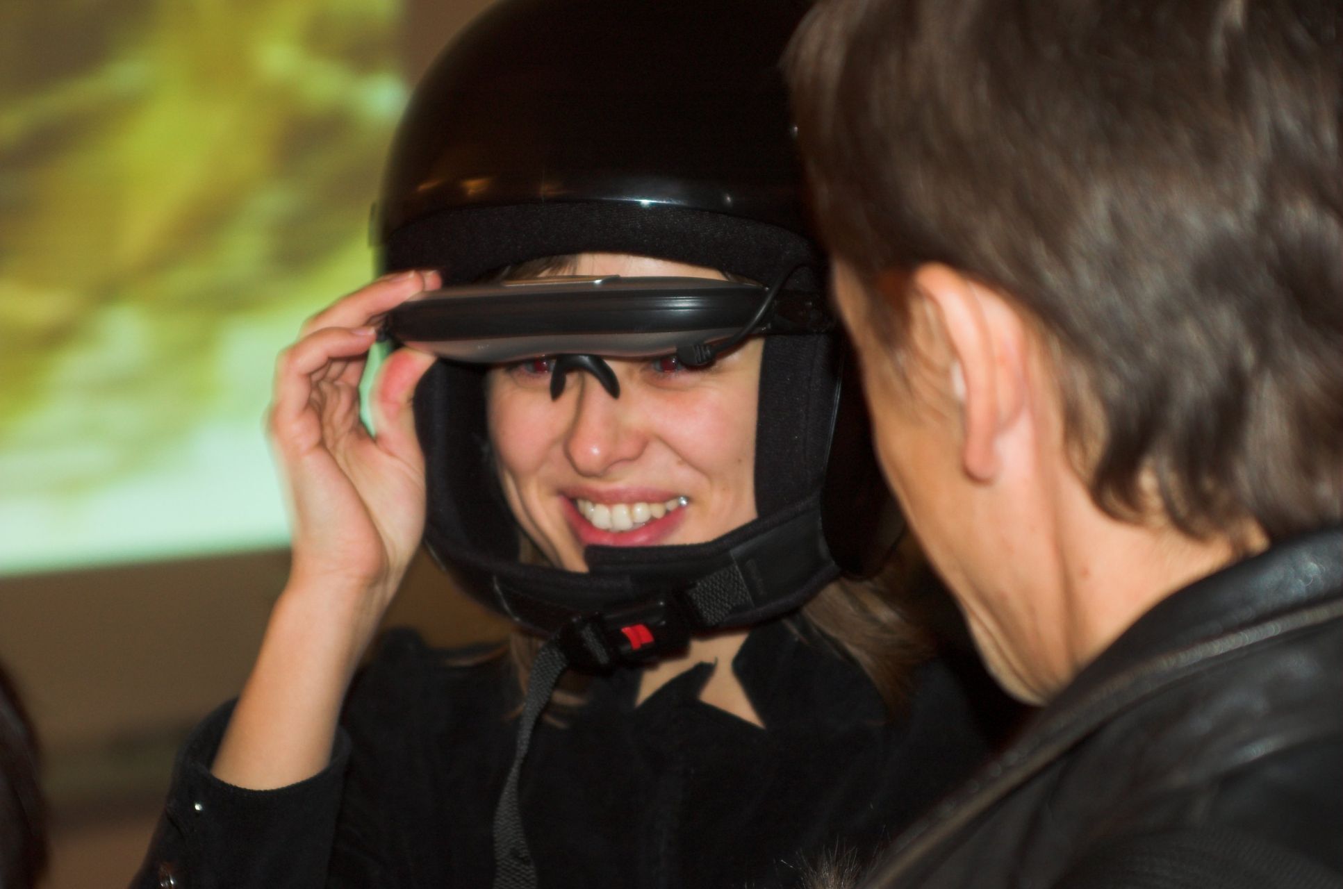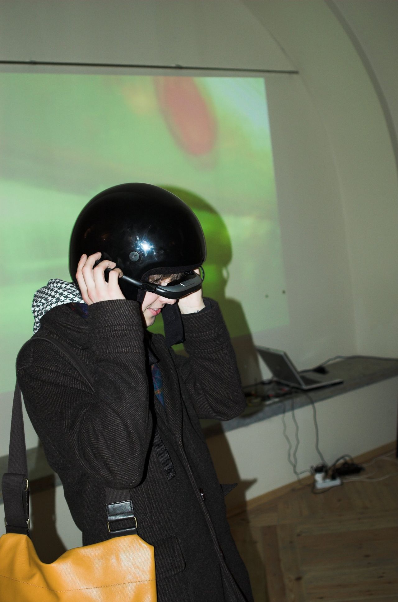 The first project of CYLAND media art laboratory was cyberperformance “Speedless”, made in the fall of 2007. The author of this project is Anna Frants (New York) with the participation of CYLAND members. A man, involved in performance (“user of video glasses”) controls a video recording, which he sees in video glasses, by movements of his body, changing speed and trajectory of motion. During the demonstration of project there is an interaction with audience (happening) and participants who are located at different geographical locations contact not only artificial reality in glasses, but also an auditory, which reacts to his actions.